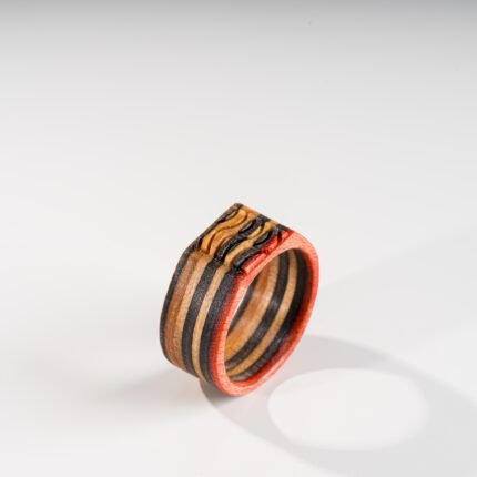 Cette bague est confectionnée à partir de véritables planches de skateboard usagées, constituées de plusieurs plis d’érable colorés. Ce matériau offre une combinaison unique de légèreté et de robustesse, avec des nuances et motifs distincts issus du skateboard d’origine.