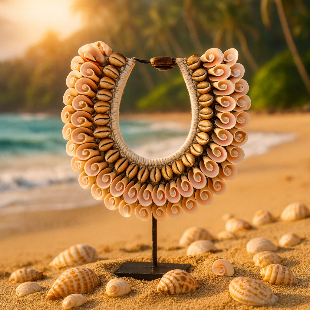 Réalisée à partir de coquillages naturels minutieusement disposés, chaque pièce présente des motifs uniques, inspirés de symboles traditionnels ou formes contemporaines.