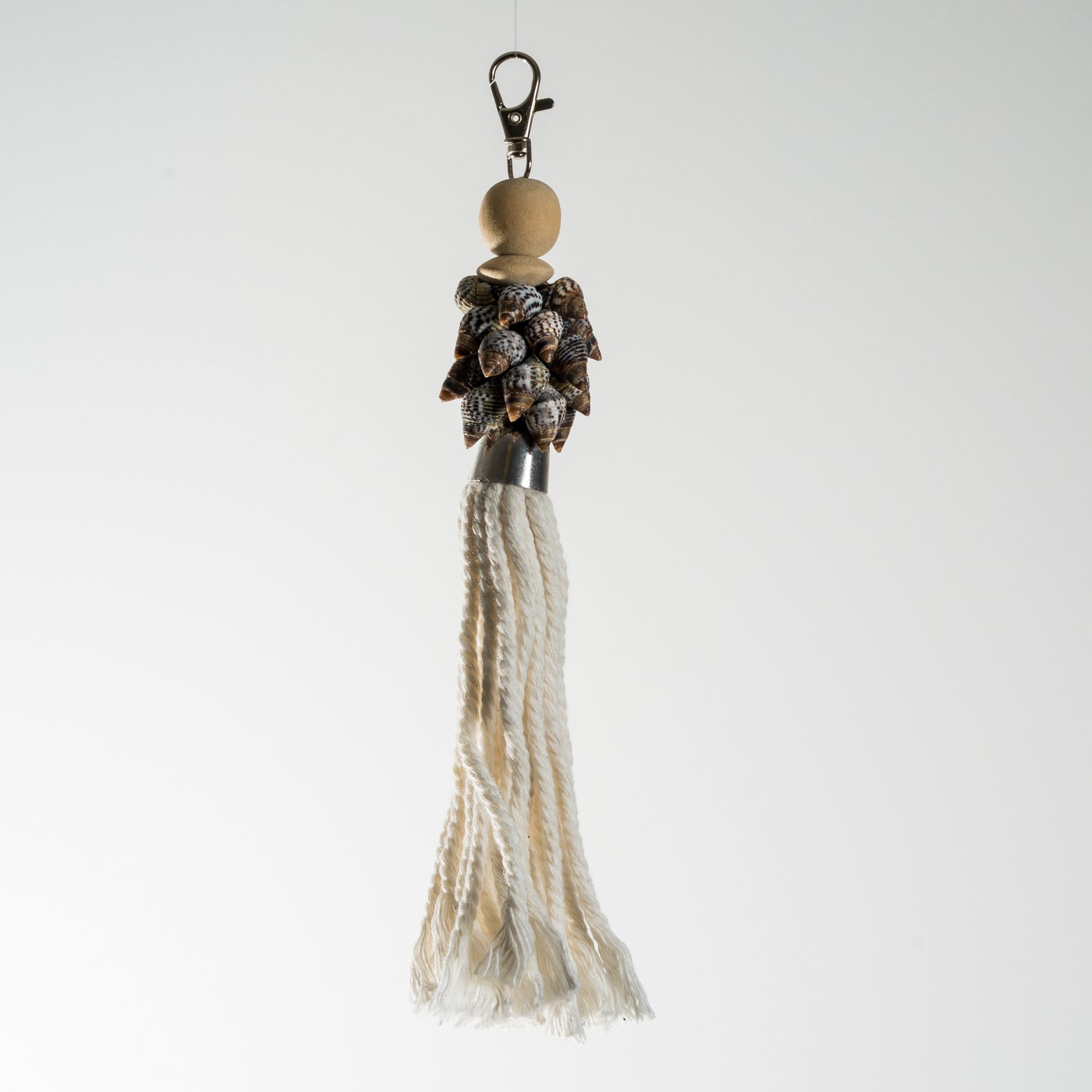 Chaque pièce associe coquillages naturels, perle en bois et cordon torsadé, montés sur un mousqueton métalliquepour une utilisation pratique et durable.